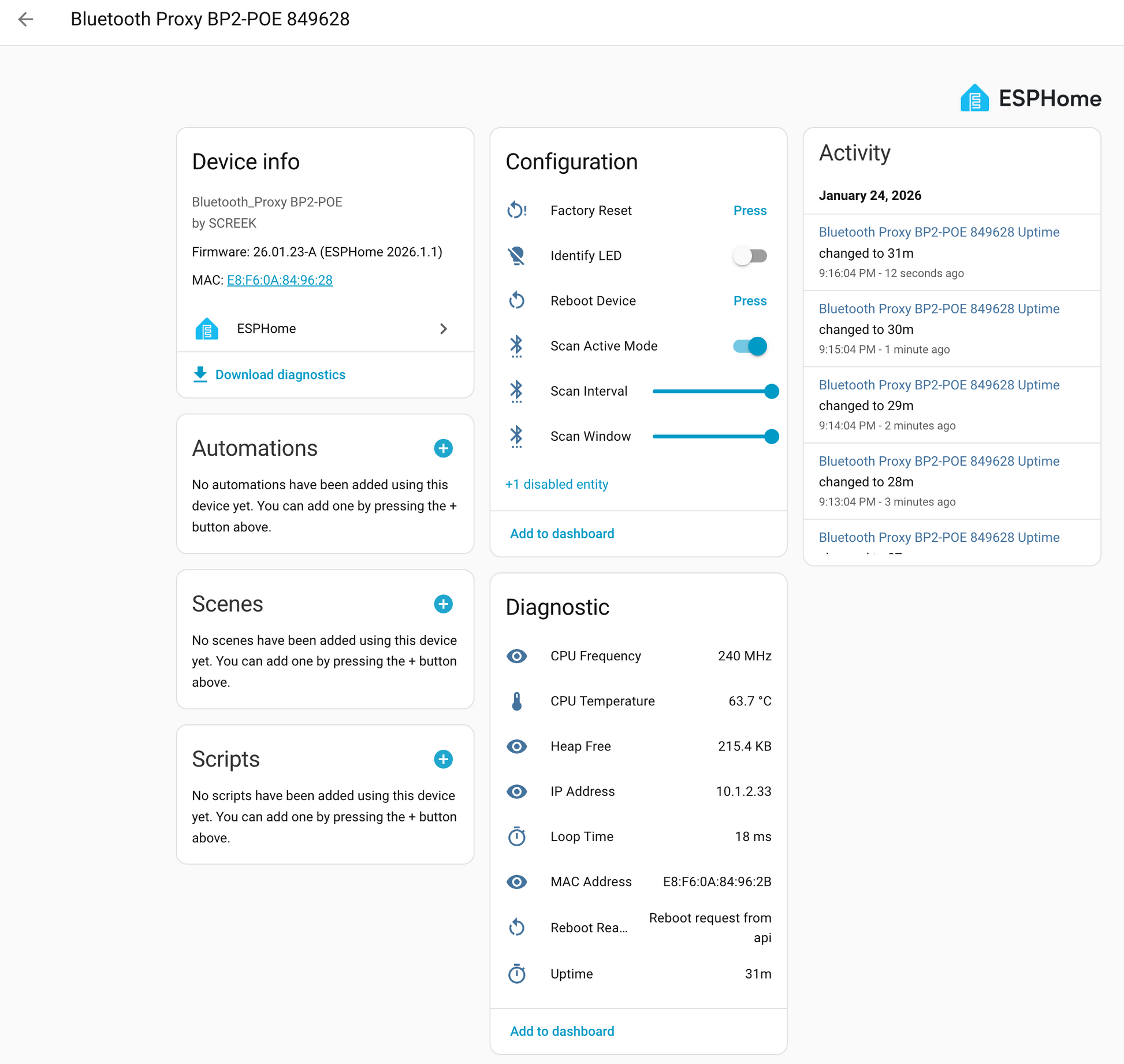 Having DIY numerous popular BP1 and BLEDongle-1M units, we sought to advance further by exploring BLE proxy functionality via direct POE and Ethernet connections. Test results proved remarkably refined, demonstrating exceptional stability and efficiency. POE power supply enables a more streamlined design, allowing placement anywhere. This, I believe, will significantly enhance Home Automation's Bluetooth capabilities to a new level.